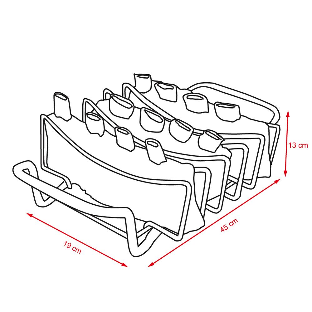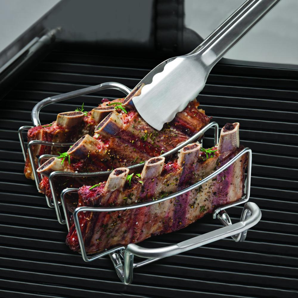 Praktikus rozsdamentes acélból készült rács pácolt bordák sütéséhez és grillezéséhez.