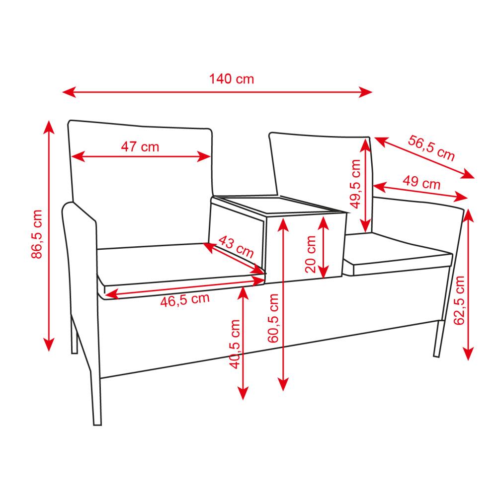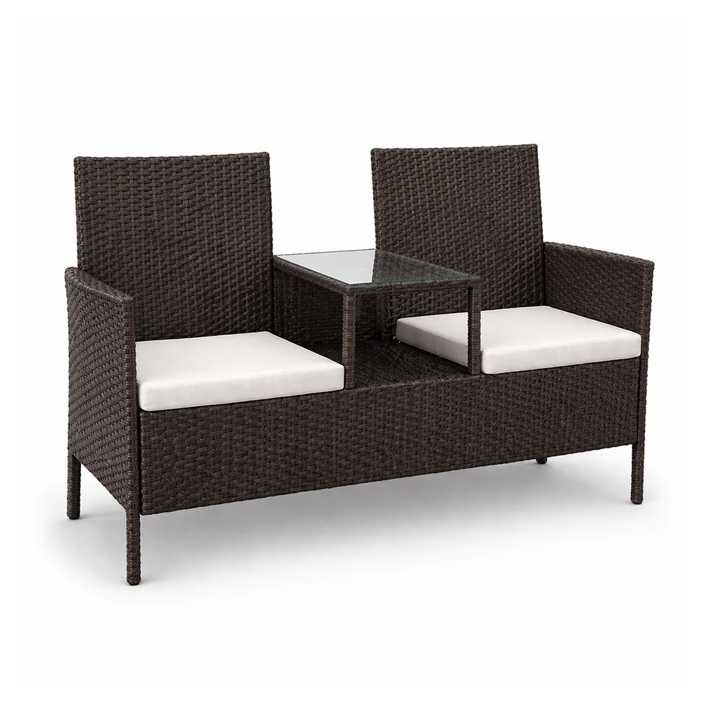 A polirattan padon kényelmesen ülhet a kertben, teraszon, erkélyen vagy a téli kertben. A műrattan ugyanolyan gyönyörű, mint a természetes rattan, viszont nem igényel annyi törődést és elleáll az időjárás viszontagságainak is. Ennek a padnak az egyedi jellemzője, hogy a két ülés között egy asztal található, amelyre harapnivalót, könyvet vagy magazint helyezhet el. A puha ülőpárnák kivehetők és könnyen tisztíthatók.