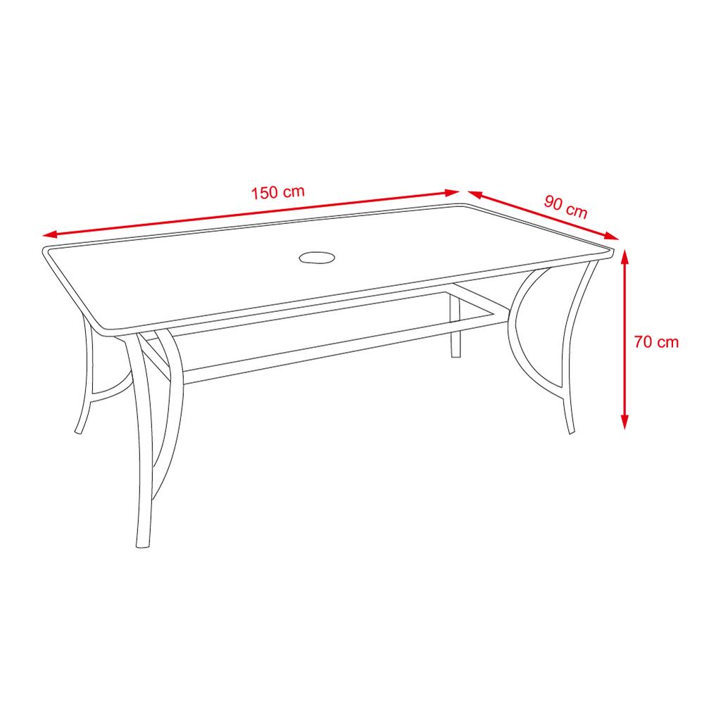 Asztallap matt edzett üvegből, lenyomat elleni felületkezeléssel, dugóval ellátott nyílás napernyő behelyezésére.