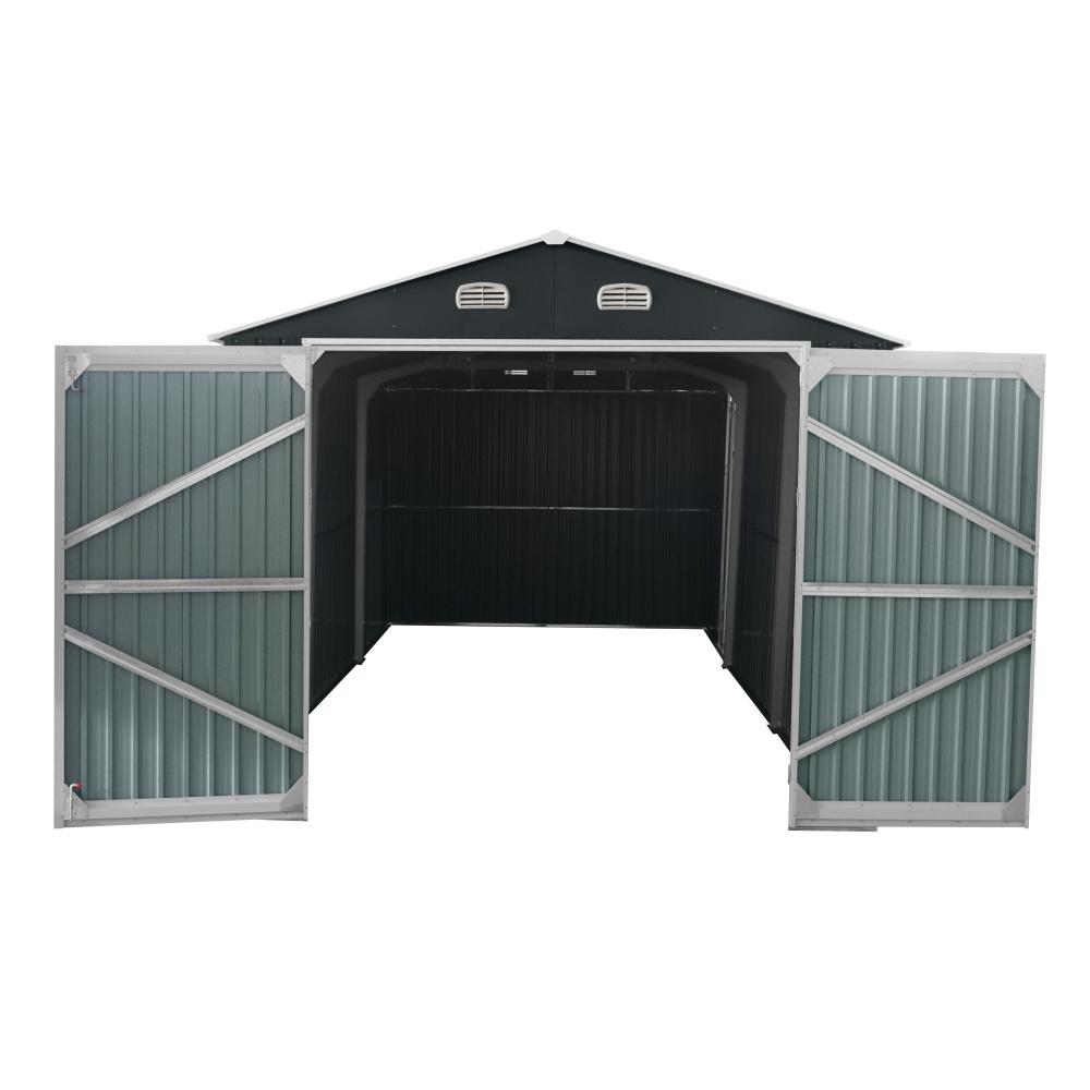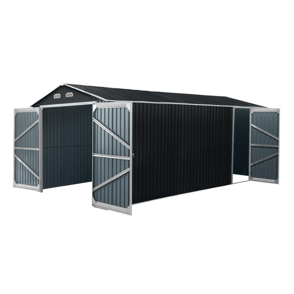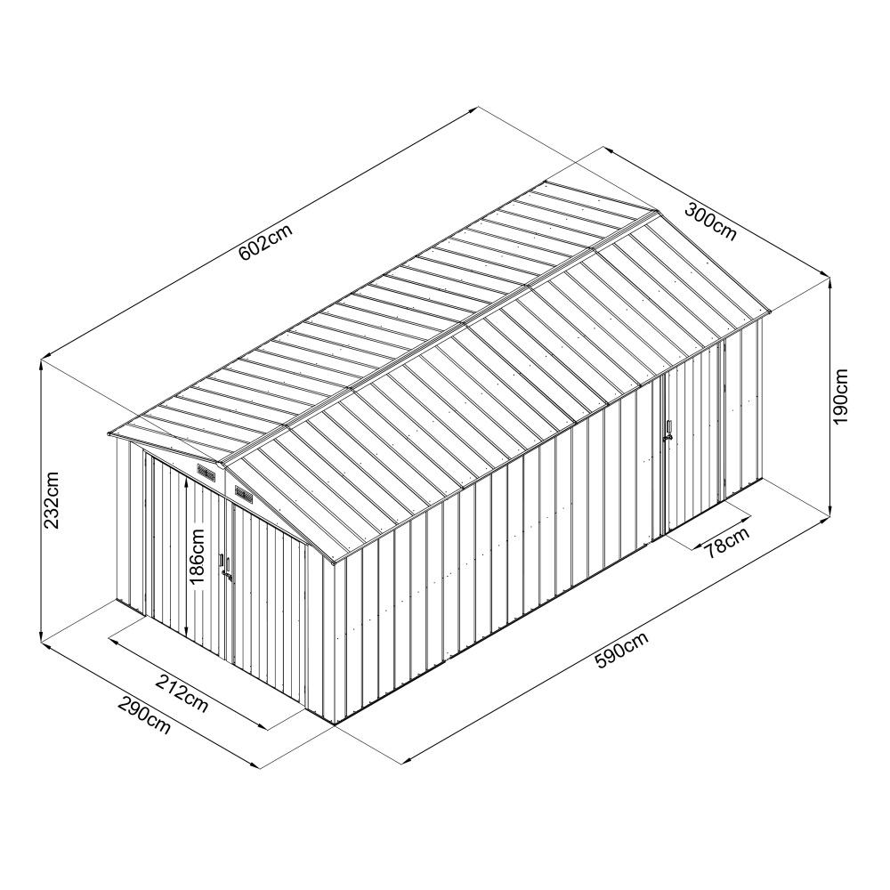 A 602×300 cm méretű fém kerti ház, garázs profilozott fémlemezből készül, falvastagsága 0,3 mm. A ház beépített földterülete 17,11 m2. Az oldalsó ajtón keresztül oldalt is kényelmesen kimehet a házból. A 212 x 186 cm-es kétszárnyú bejárati ajtó kellően nagy a nagyobb terepjárók számára is.