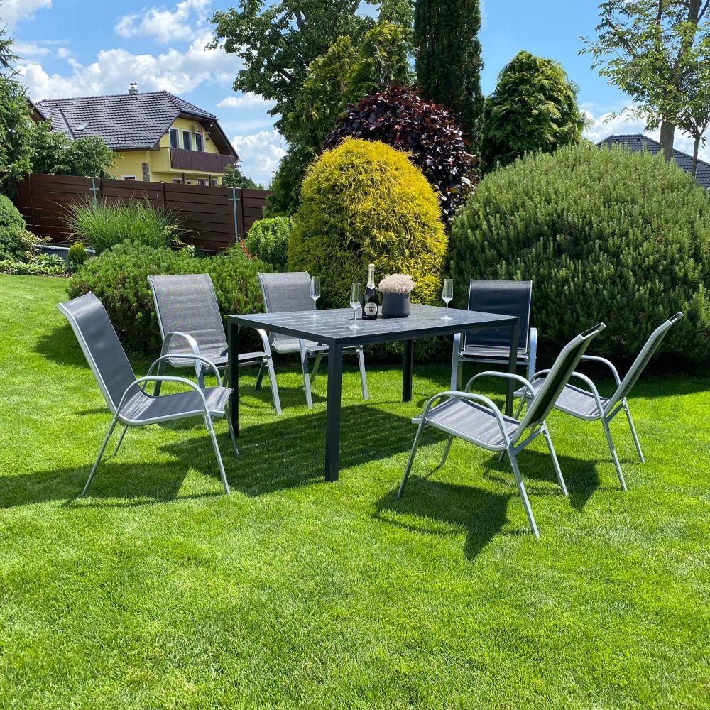 A VIKING L + RAMADA/ALINA kerti szett egy nagy asztalból és hat egymásba rakható fém székből áll.
