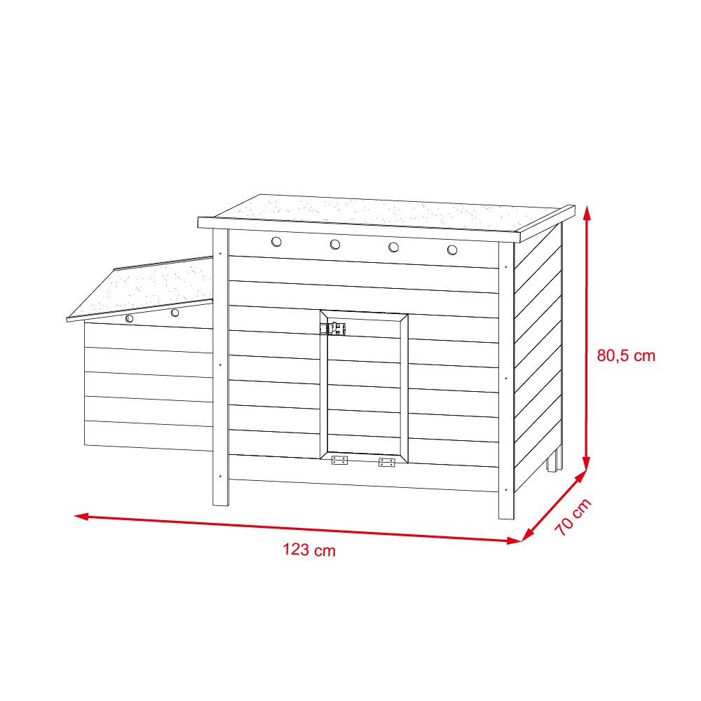 A tyúkól aszfaltozott tetővel van ellátva, amely hatékonyan megakadályozza a víz behatolását, így még esős napokon is száraz és kényelmes környezetet biztosít a baromfi számára. A RUFUS tyúkól univerzális és alkalmazkodó, így illik a legkülönbözőbb környezetekbe - a hátsó udvarba, a