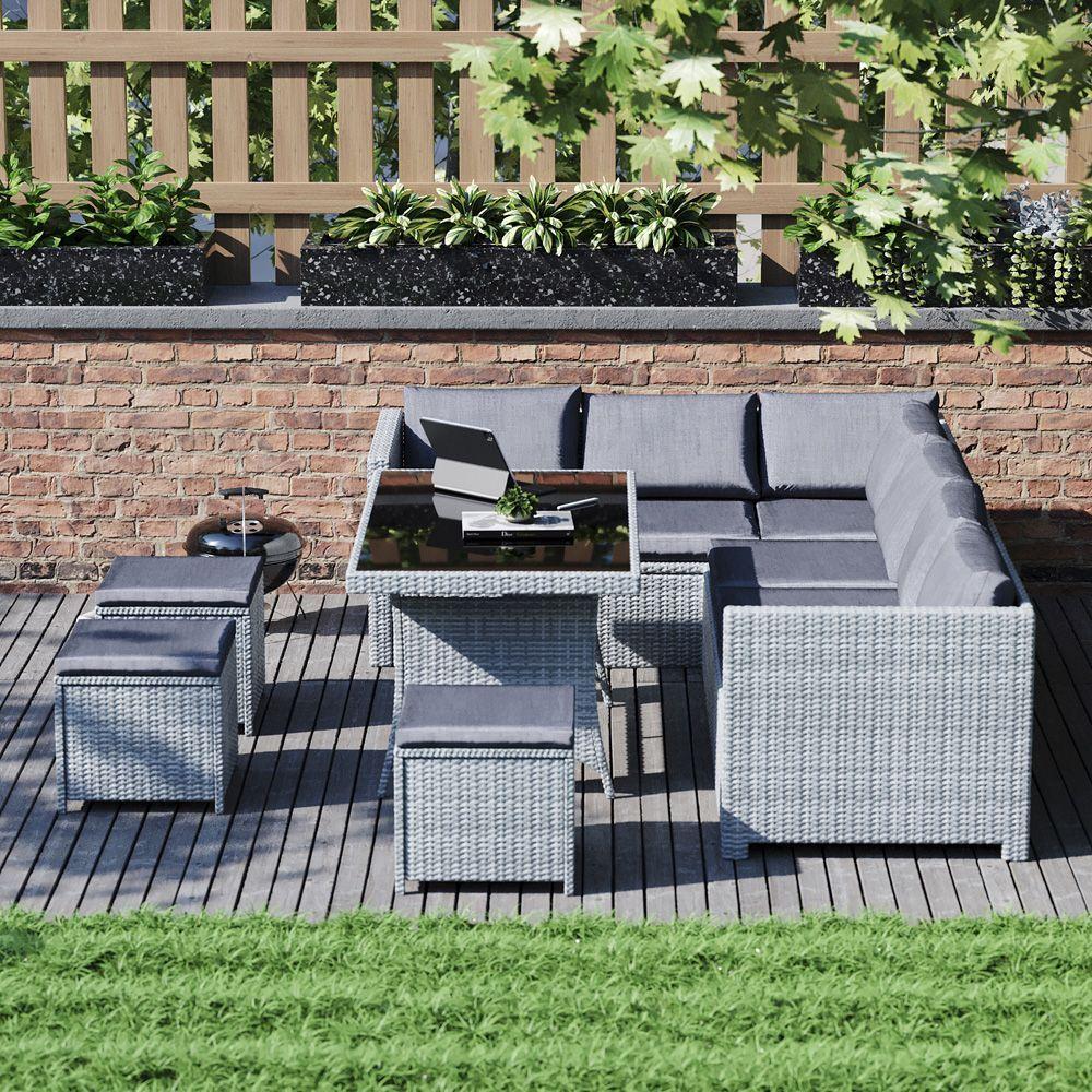 kerti garnitúra egy tágas sarokkanapéból, egy praktikus, edzett üveglappal ellátott asztalból és három kényelmes taburettből áll, hogy tökéletes kerti pihenősarkot alakíthasson ki.