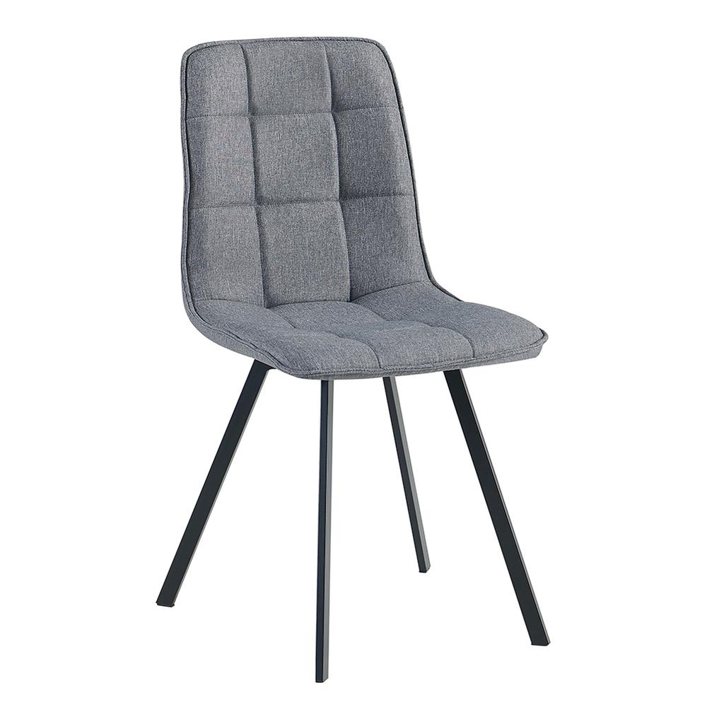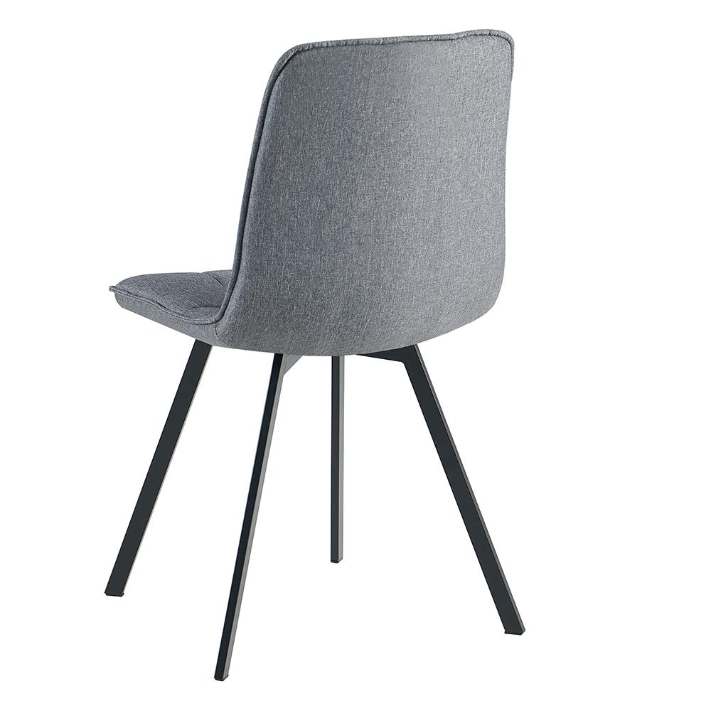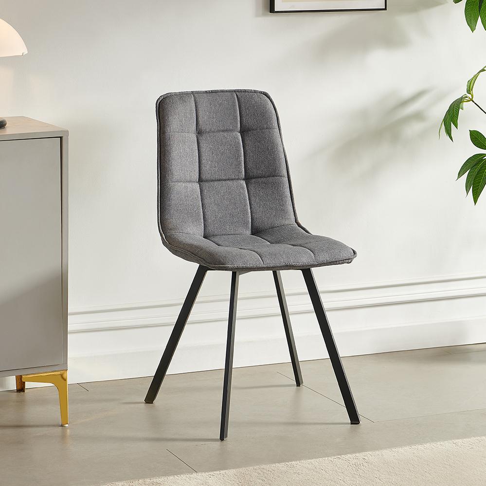 A szürke anyaggal kárpitozott székek magas háttámlával, díszes varrással és kényelmes ülőfelülettel rendelkeznek. A csiszolt fekete fém lábak nemcsak stabilitást biztosítanak, hanem a szék dizájnjával is összhangban vannak.
