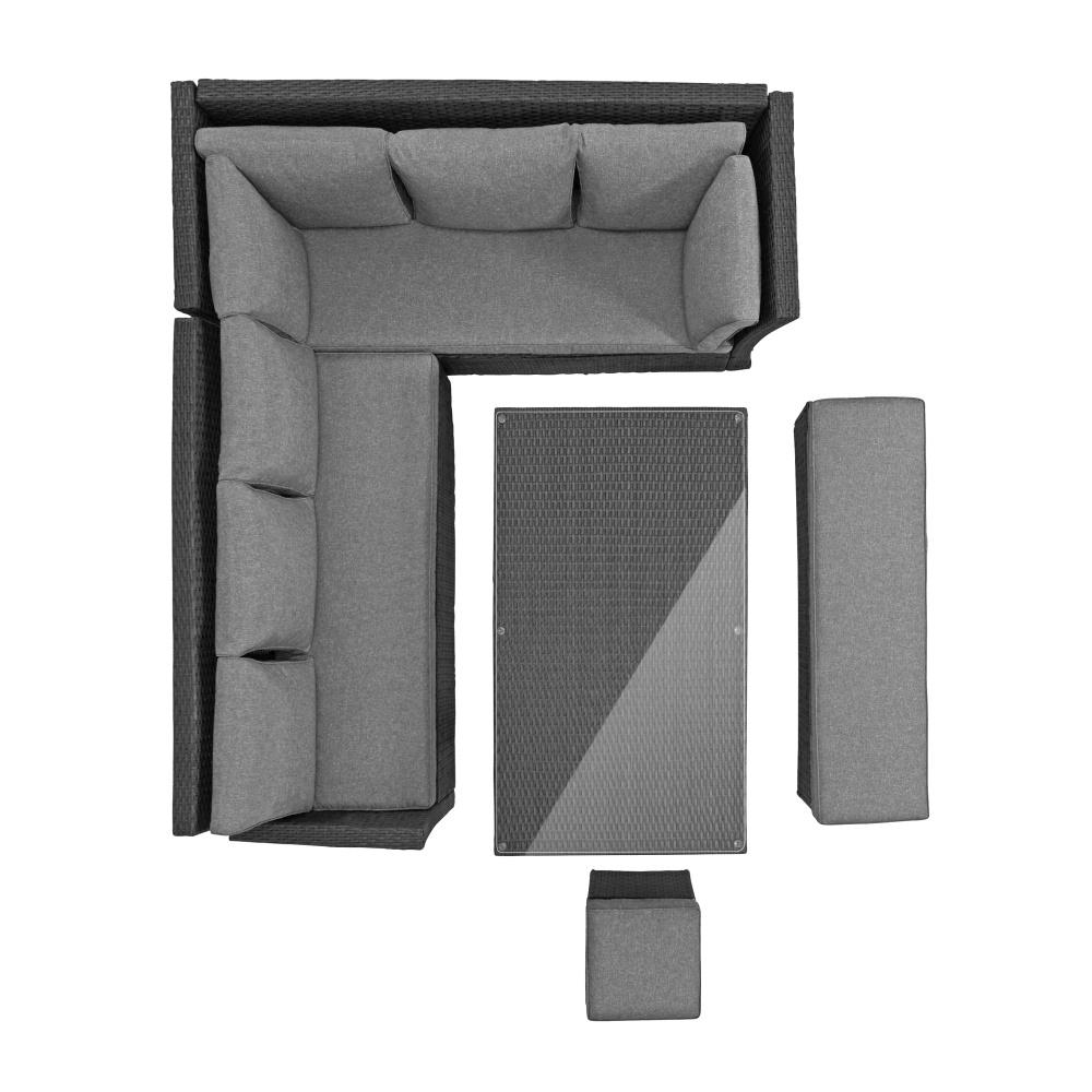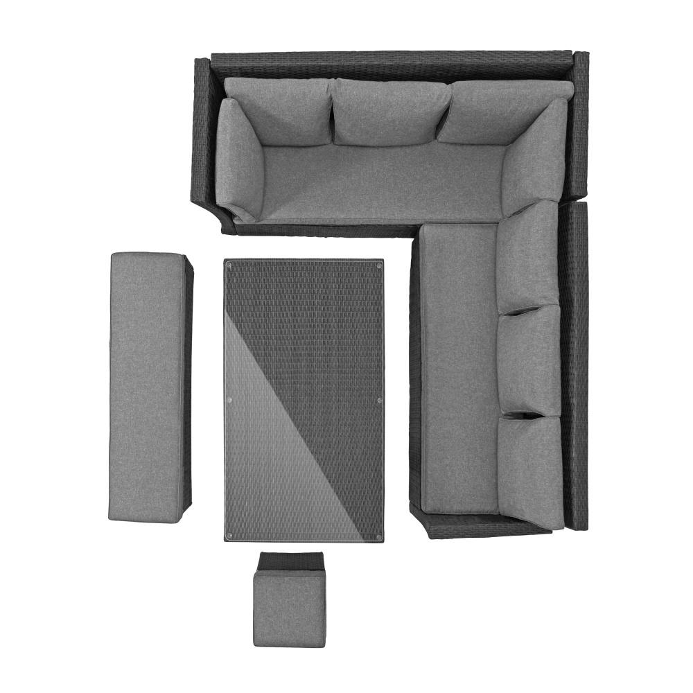 A garnitúra ezenkívül egy hosszú, kényelmes paddal is rendelkezik teljes értékű oldalsó résszel, valamint egy puffal.