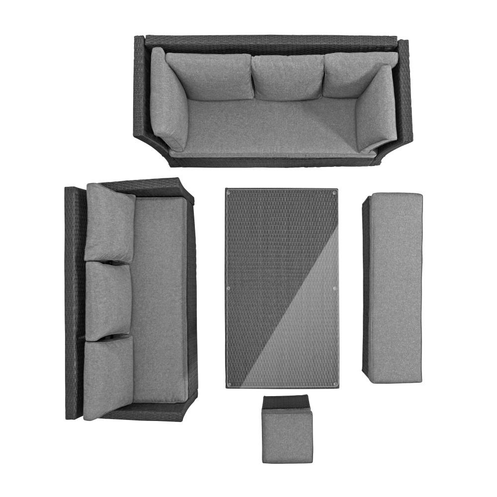 Ennek az összeállításnak az egyik legfontosabb előnye a tágassága, hiszen akár 9 fő számára is kényelmes használatot biztosít. További előnye a praktikussága: kiválóan használható étkezőgarnitúraként, például ebéd vagy vacsora felszolgálásához a teraszon, de egyben tökéletes helyet nyújt a pihenéshez és kikapcsolódáshoz is egy nehéz nap után.