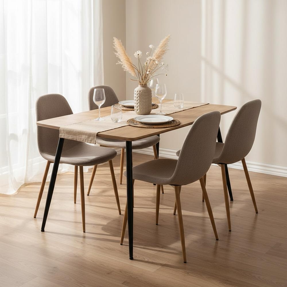 A tiszta vonalú asztalt elegáns kárpitozott székek egészítik ki, amelyek minden étkezést kellemesebbé tesznek – legyen szó gyors reggeliről, családi ebédről vagy esti összejövetelről.