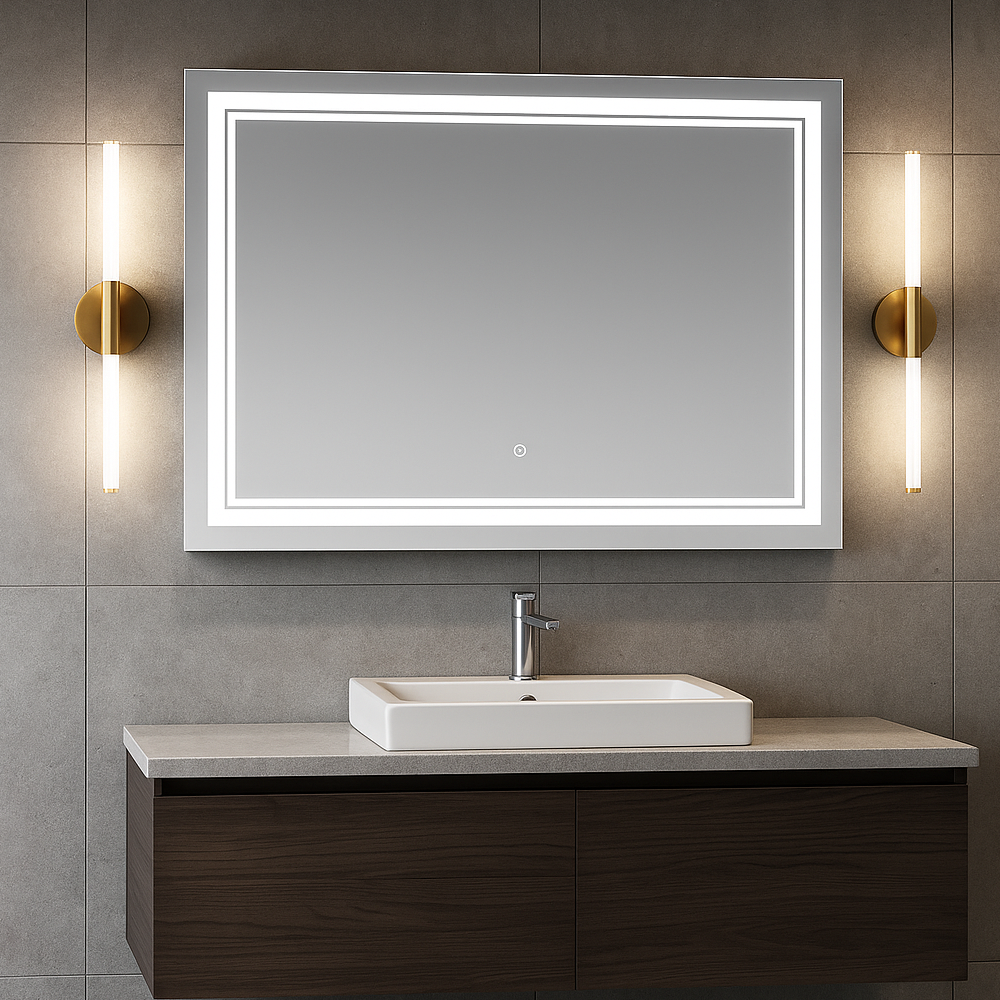 Tükör LED világítással 90 × 70 cm – nagy méret, érintőgombos vezérlés és állítható fény a tökéletes napi rutinhoz.