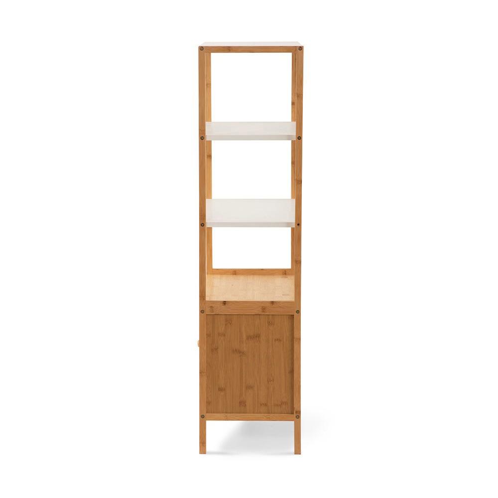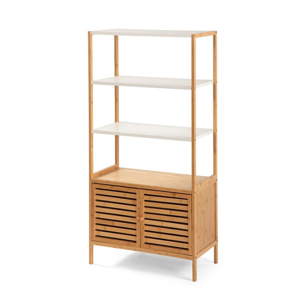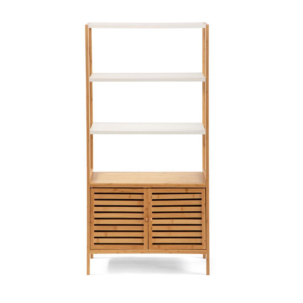Természetes bambusz, fehér polcok és zárható tárolórész – stílusos szekrény, amely rendet és elegáns megjelenést visz a térbe.