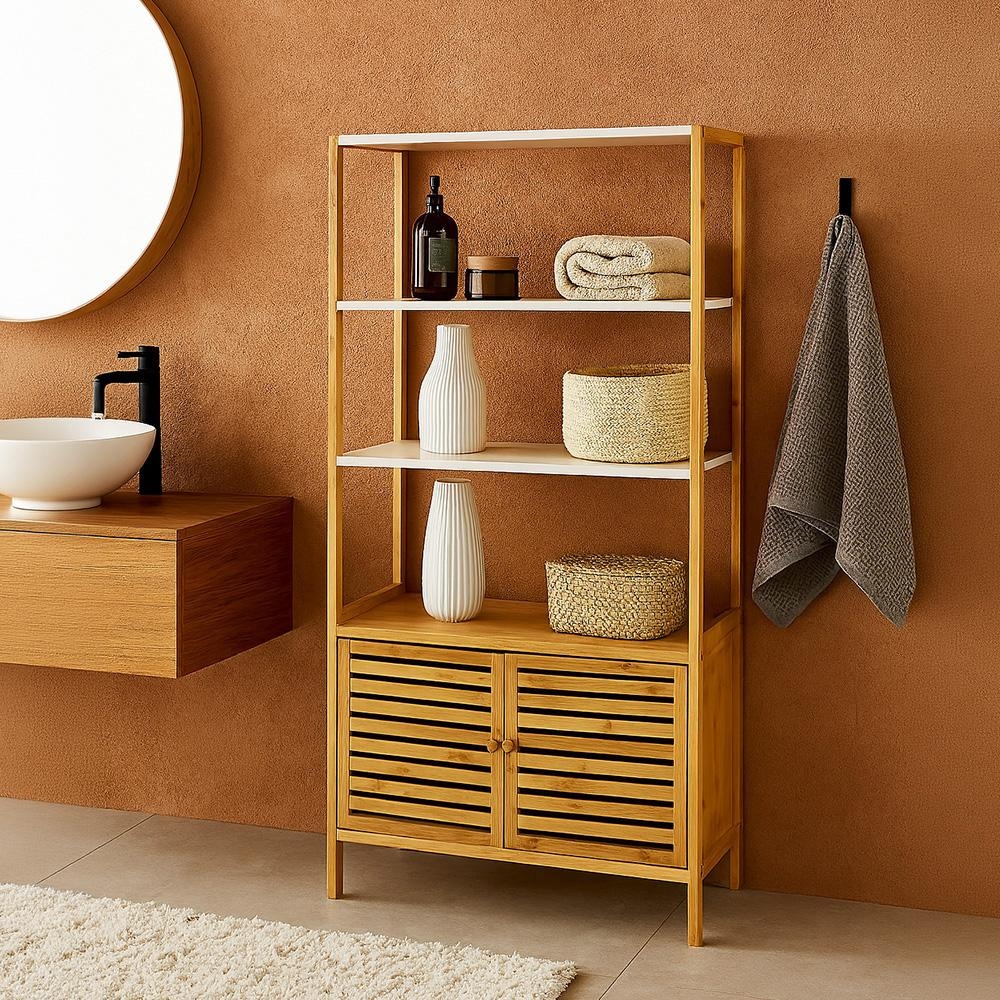 AVENBERG BAMBU STRADO bambuszszekrény – a bambusz és a fehér elegáns kombinációja, amely rendet és stílust visz a fürdőszobába.