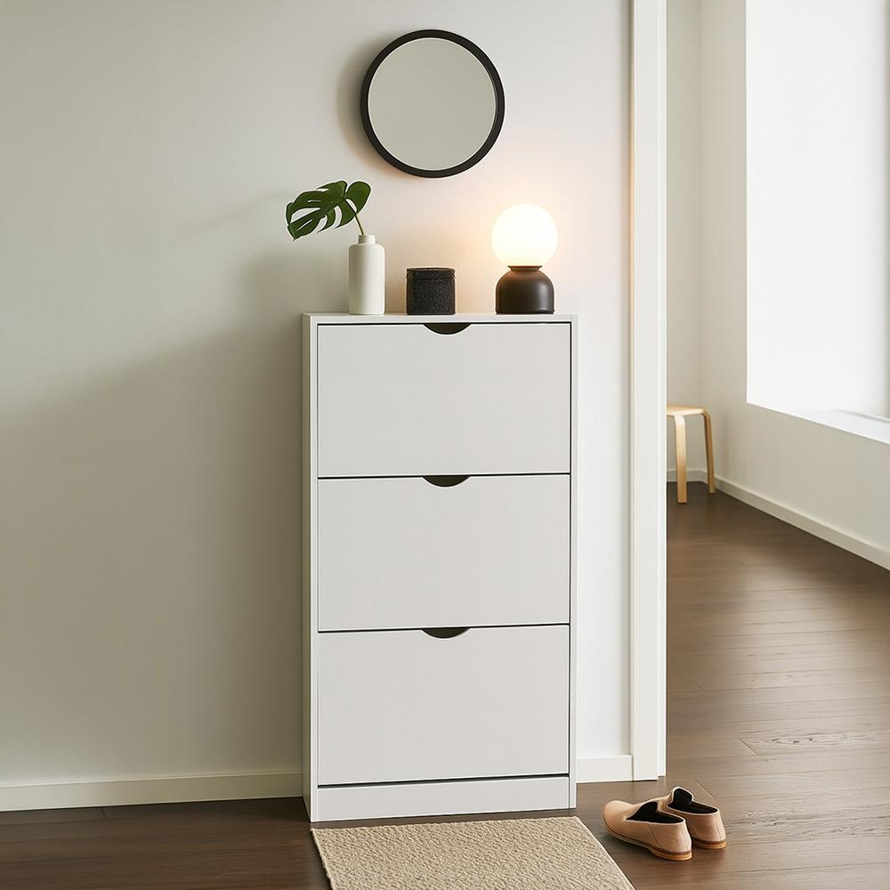három billenő rekesznek köszönhetően a cipők átláthatóan tárolhatók, miközben rejtve maradnak, így az előszoba tiszta és rendezett hatást kelt. A keskeny mélység és a minimalista dizájn tökéletes választássá teszi modern és skandináv enteriőrökbe is.