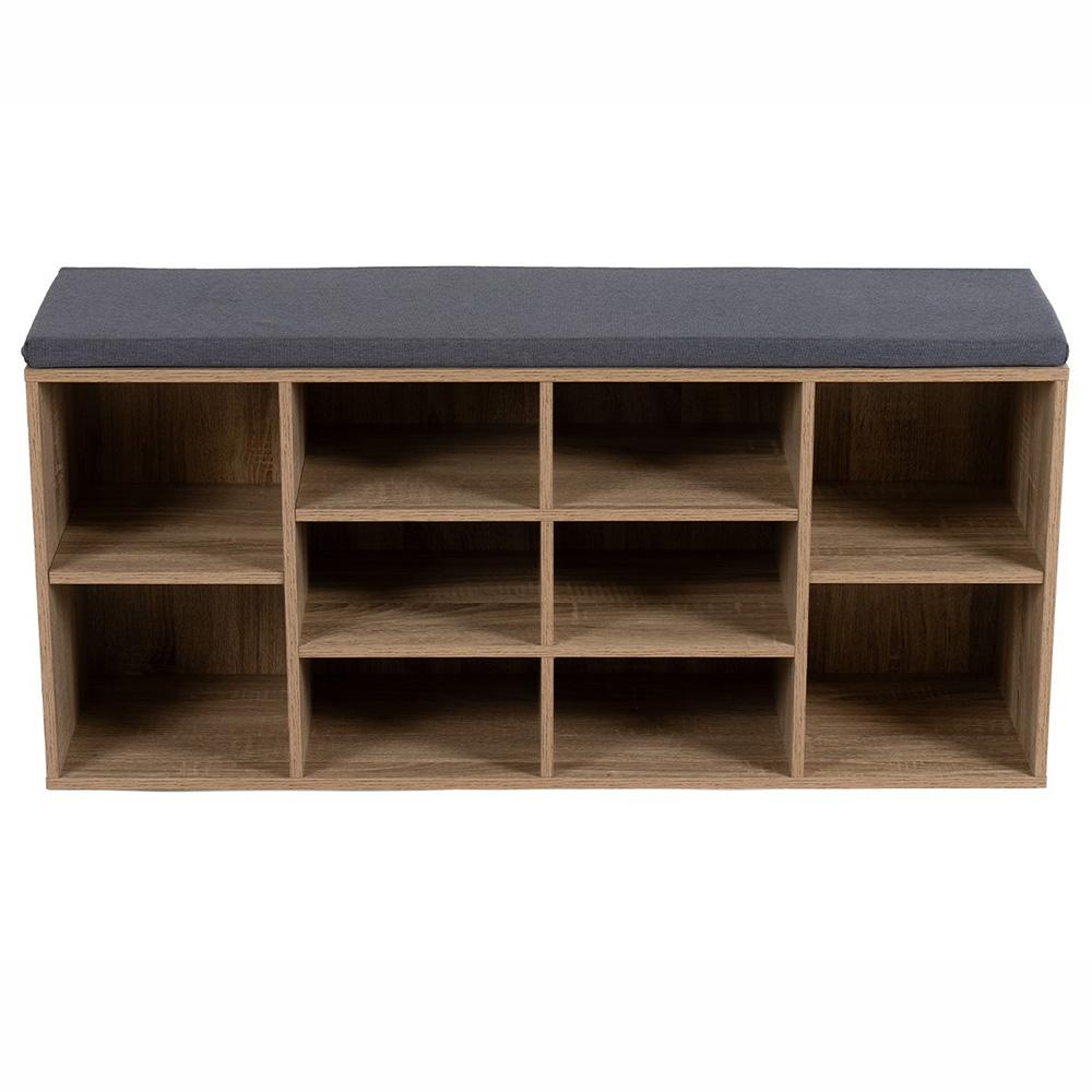 kárpitozott ülőrésszel ellátott cipőtartó természetes MDF dekorral ideális kiegészítő a folyosóra, az előtérbe és a gardróbba is.
