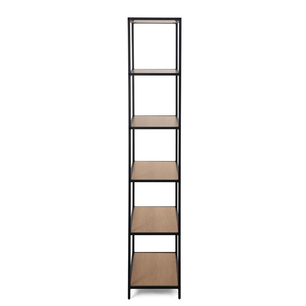 masszív, fekete színű acélszerkezetet természetes fa dekorú polcokkal kombinálja. Nyitott kialakításának köszönhetően könnyed hatású, ugyanakkor stabil – ideális a nappaliba, a dolgozószobába, a hálószobába és az előszobába is. Remekül használható könyvek, dekorációk, növények és tárolódobozok számára.