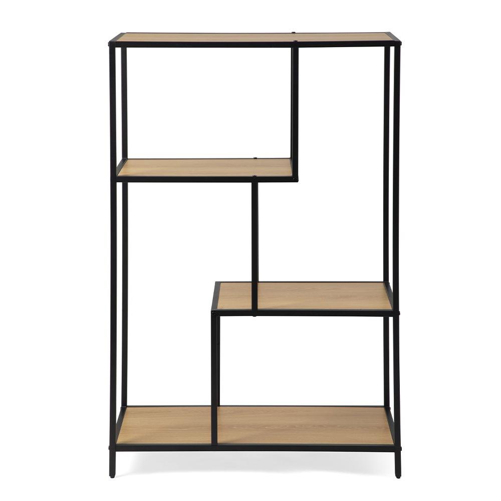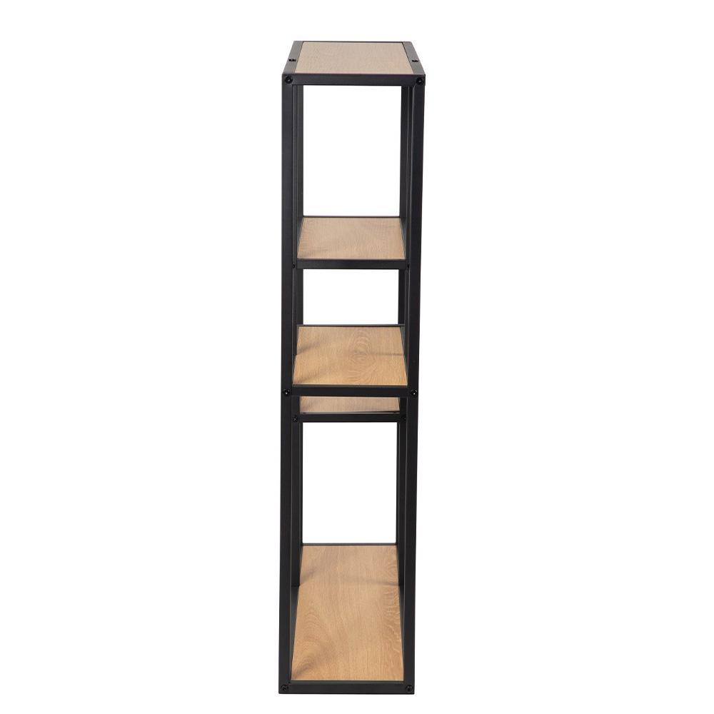 masszív, fekete színű acélszerkezetet matt tölgyfa dekorú polcokkal kombinálja. Méreteinek köszönhetően jól illik a nappaliba, a dolgozószobába és az előszobába is – könyvek, dekorációk, dobozok és mindennapi apróságok számára.