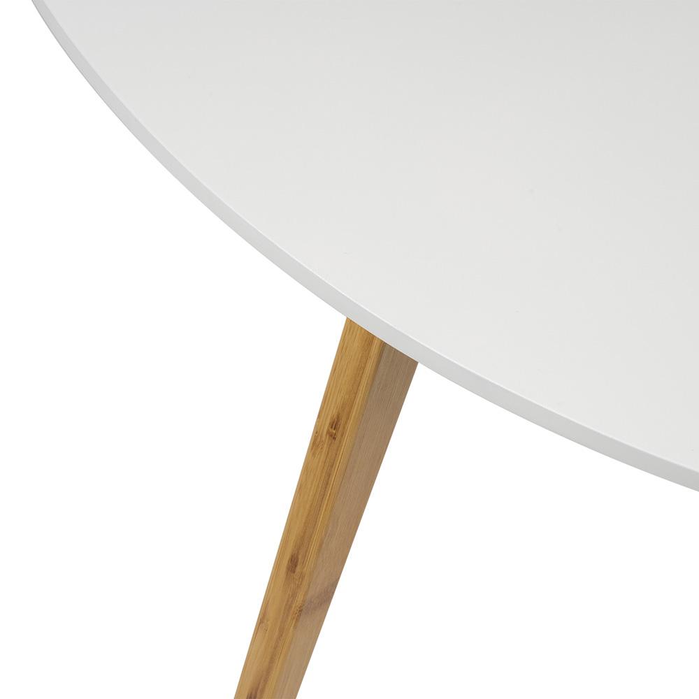 fehér MDF asztallapot természetes bambuszlábakkal ötvözi, így remekül illik modern és klasszikus lakberendezésű otthonokba is. Használható dohányzóasztalként a nappaliban, praktikus asztalként a dolgozószobában vagy stílusos kiegészítőként a hálószobában.