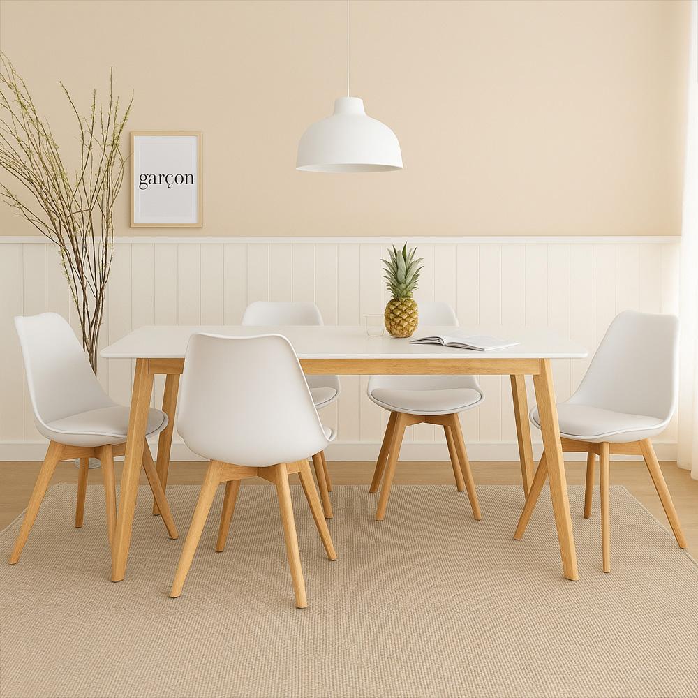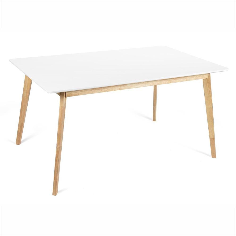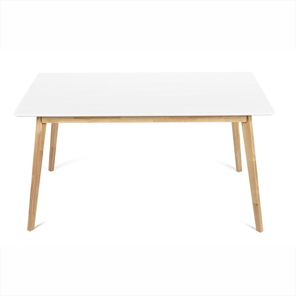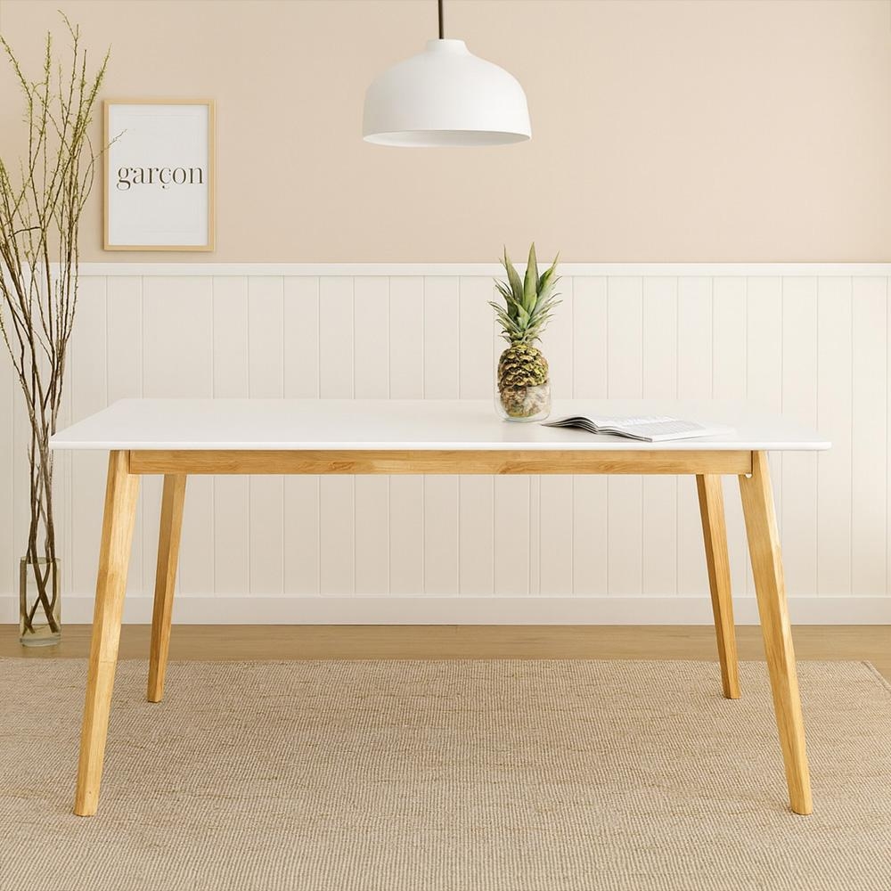 Tágas étkezőasztal fehér asztallap és természetes fa kombinációjában – letisztult skandináv dizájn a mindennapi étkezésekhez és a vendégek fogadásához.