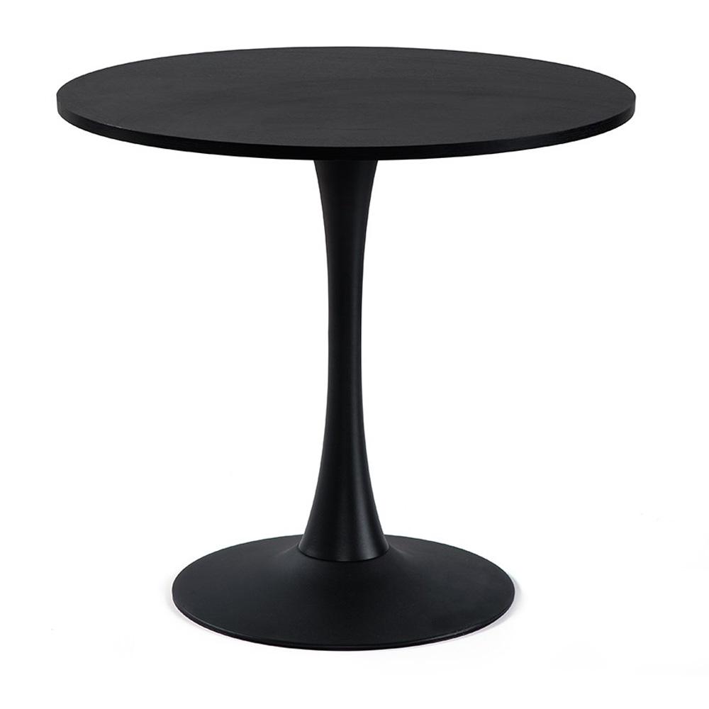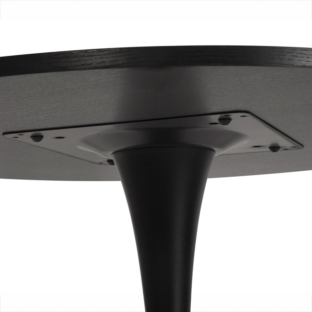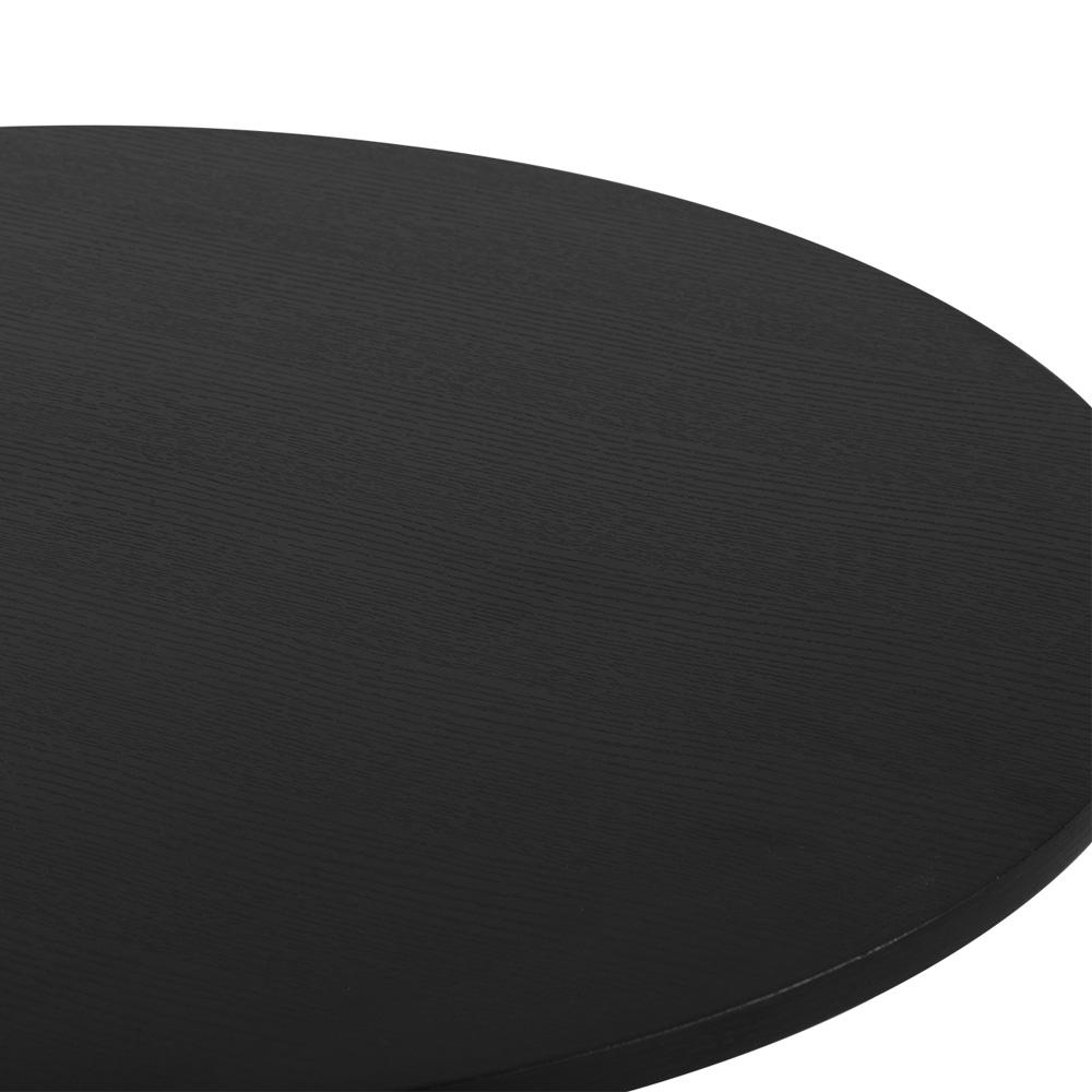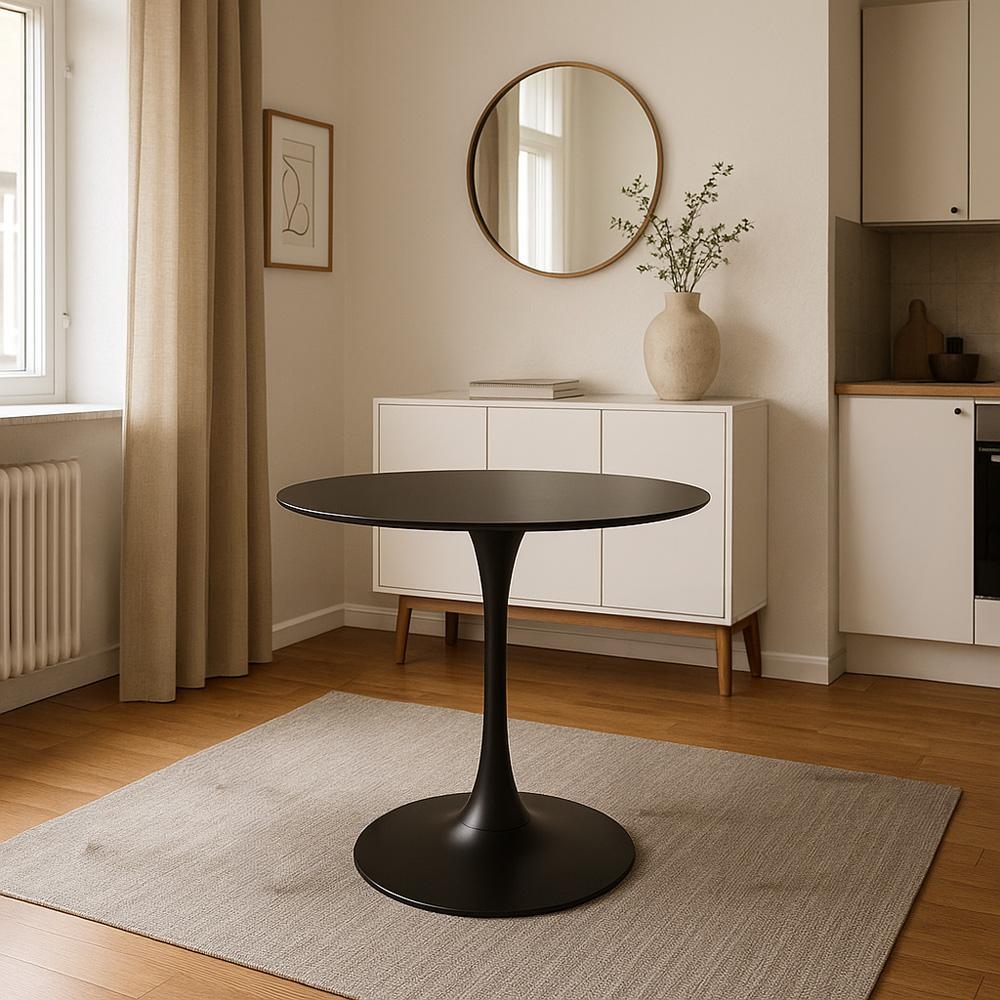 Kerek étkezőasztal fekete színben, finom faerezetes struktúrával – elegáns dizájn egy lábbal a kényelmes ülésért.