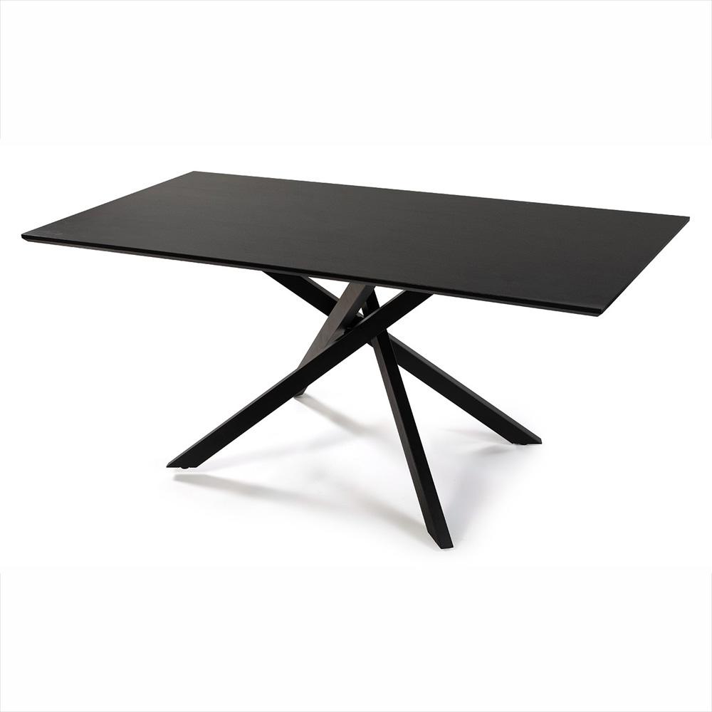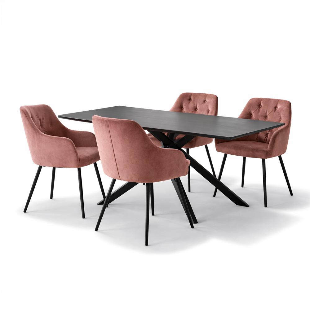 AVENBERG OPAL étkezőgarnitúra – 4 szék + 180 cm-es asztal, modern fekete asztal és rózsaszín kárpitozott székek kombinációja a stílusos étkezéshez.