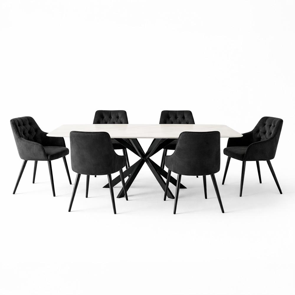 AVENBERG OBSIDIAN – nagy étkezőgarnitúra 200 cm-es, fehér márványdekoros asztallal és 6 fekete székkel a modern, elegáns étkezéshez.