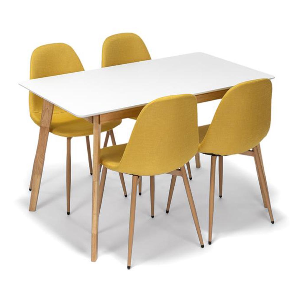 AVENBERG CITRINE – kompakt étkezőgarnitúra letisztult skandi asztallal és négy sárga székkel, amely ragyogóbbá teszi az étkezősarkot.