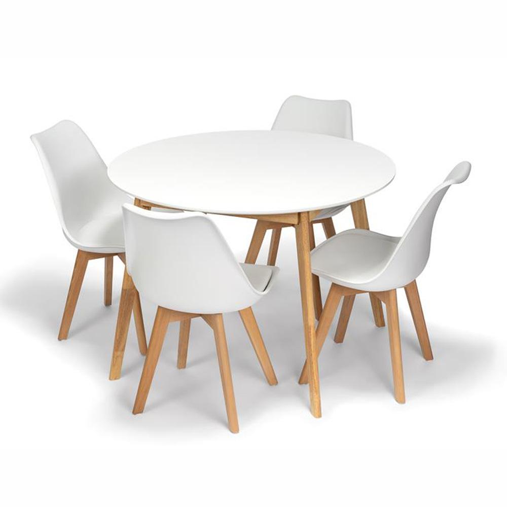AVENBERG PEARL – világos, skandináv étkezőgarnitúra 4 személy részére, Ø105 cm-es kerek asztallal és négy székkel, amely remekül mutat minden konyhában és étkezőben.