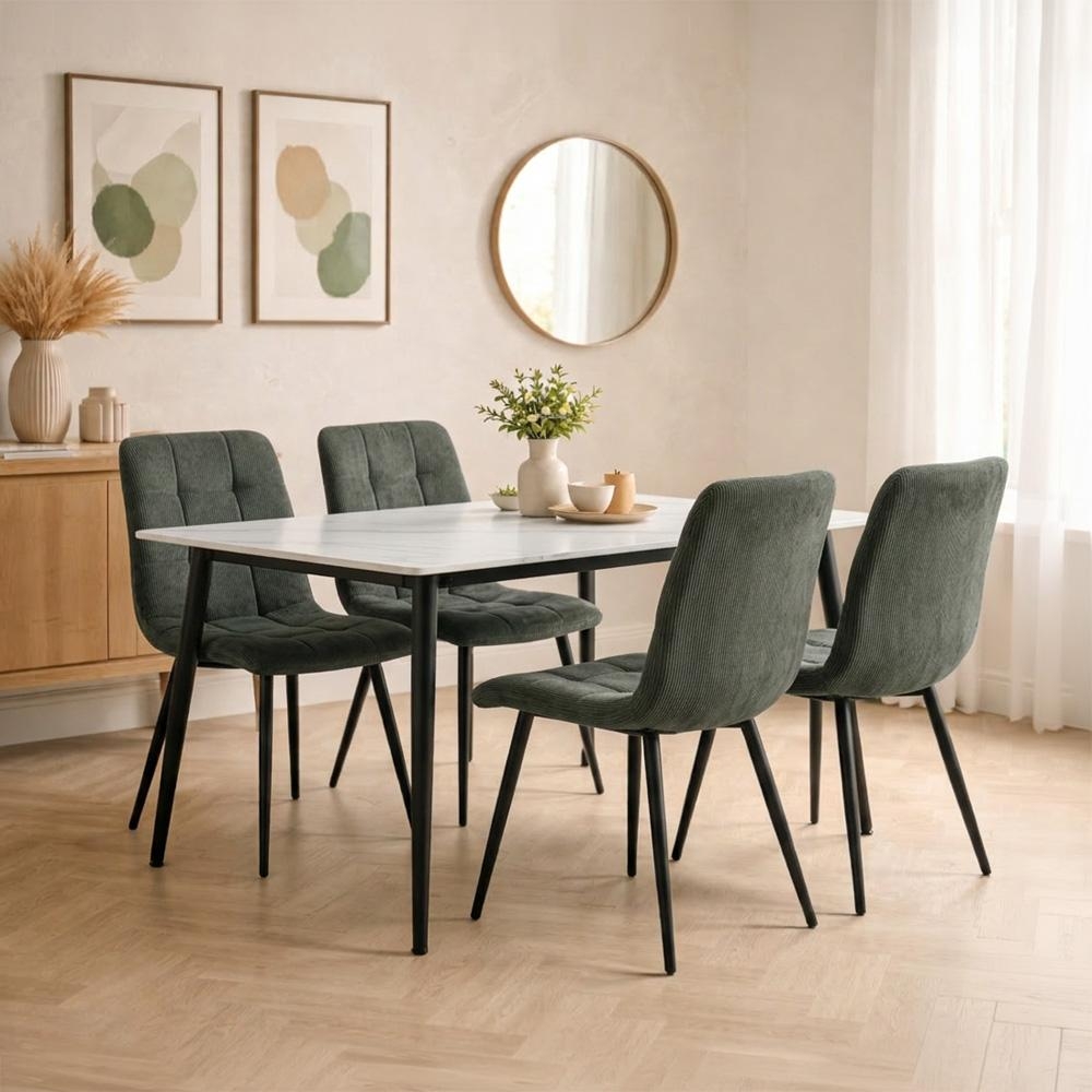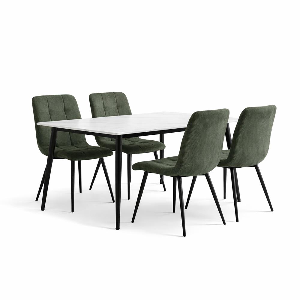AVENBERG EMERALD – elegáns étkezőgarnitúra fehér, márványdekoros kerámia asztallappal és olívazöld kordbársony székekkel a modern, otthonos étkezésekhez.